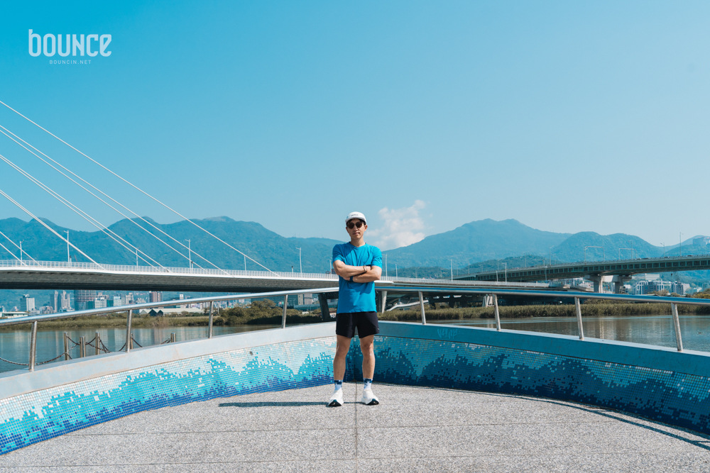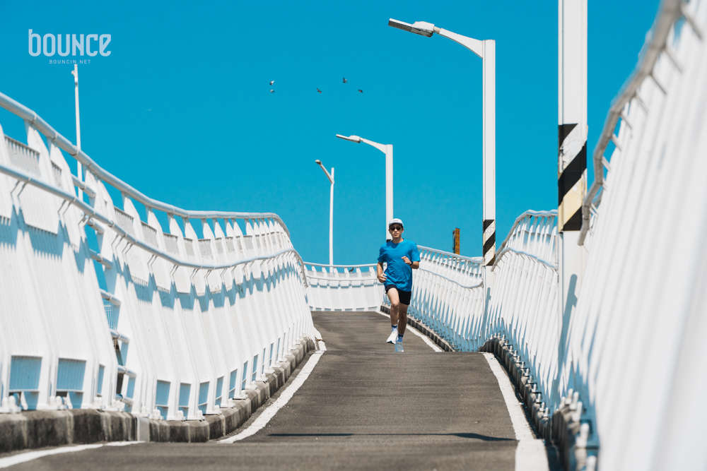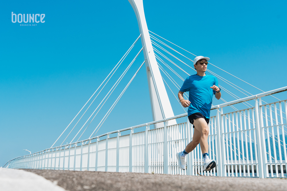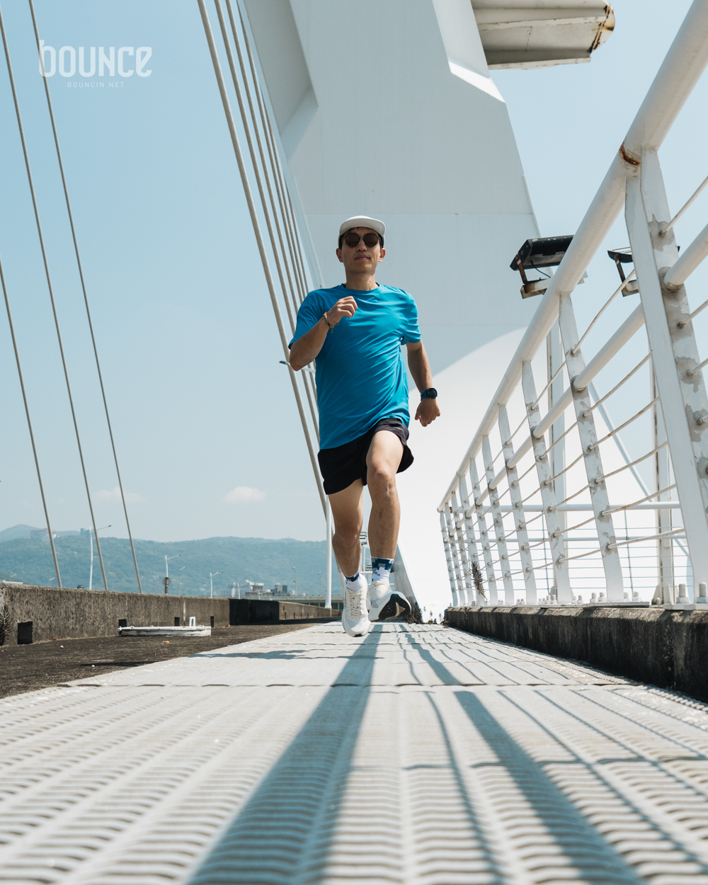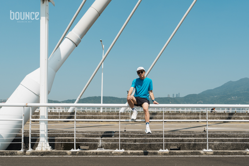 在正職工作、攝影接案,以及攀岩、越野跑等多重角色之間切換,讓他更加了解「穿對鞋」這件事的幫助有多大。對他來說,「外型」是第一道門檻:「一雙讓人想穿的鞋,自然會提升出門跑步的意願,進而影響訓練頻率。」伍峰說到,「這次穿的『雪岩白/晴空藍』配色,整體很簡單、很清爽,就跟拍攝當天的好天氣一樣舒服。」