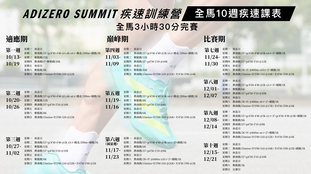 進入備戰期,adidas 號召跑者們穿上 ADIZERO 冠軍跑鞋透過《ADIZERO SUMMIT 疾速訓練營》的 10 週訓練課表,參與跑團的課程或依照課表自主訓練,不僅為年末賽季揭開序幕,更凝聚全台跑班、跑團的團結與默契,讓每位跑步愛好者與夥伴並肩前行,共同備戰年末賽季。