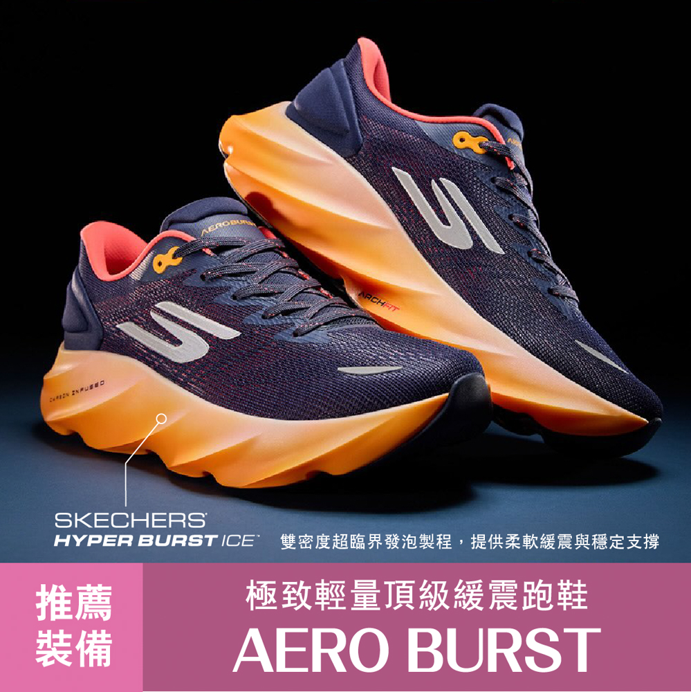 而在長距離訓練與賽後恢復階段,跑者更需要一雙能「接住疲勞」的鞋款。頂級高緩震跑鞋 SKECEHRS AERO BURST 採用雙密度 HYPER BURST ICE™ 超臨界發泡中底,外層提供穩定支撐,內層則帶來柔軟回彈腳感,在吸震與推進之間取得平衡;結合 HYPER ARC™ 律動結構與碳纖維推進翼板設計,使步態轉換更加流暢,有效降低長時間跑動對足部與下身的負擔,成為長距離與恢復跑階段不可或缺的關鍵裝備。