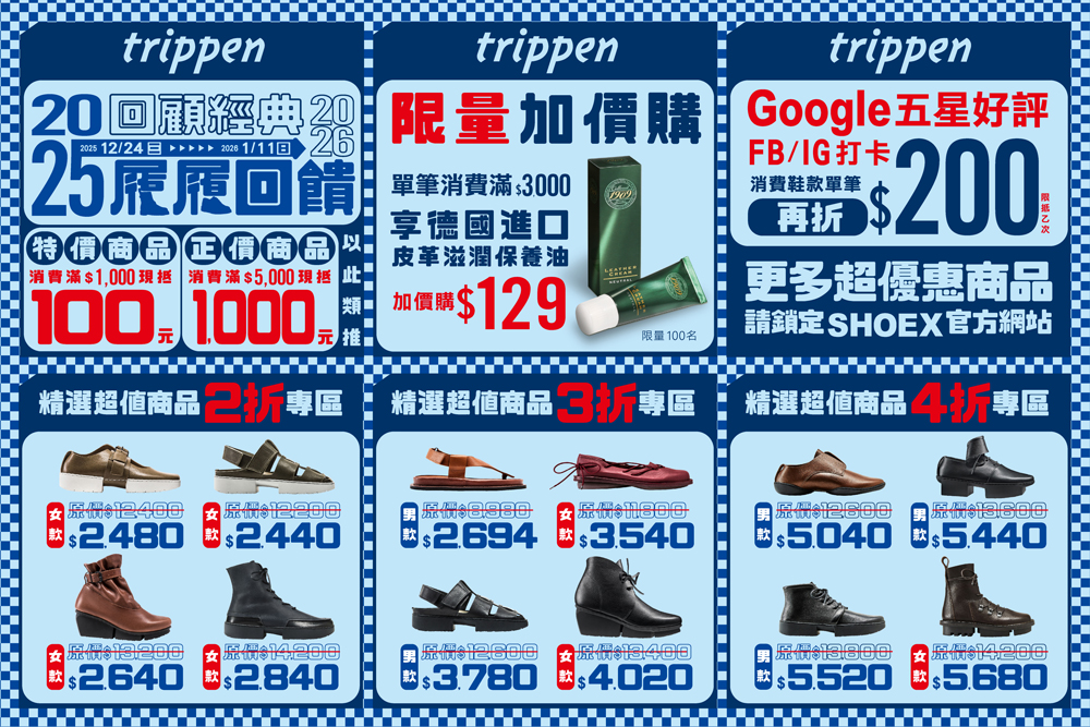歲末將至,SHOEX 攜手獨家代理雙強精品鞋款品牌:Dr. Martens 與Trippen,自 2025 年 12 月 24 日至 2026 年 1 月 11 日,於全台指定門市盛大舉辦為期 19 天的【2025 年終回饋特賣】活動,一口氣釋出年終最強優惠陣容!英國潮履品牌 Dr. Martens,集結多款馬汀不敗鞋型與高話題潮履,從陪伴無數次街頭與舞台的 1460 八孔馬汀靴、歷久不衰的 1461 三孔馬汀鞋,到冬季不可或缺的麂皮馬汀鞋全面到位,不僅釋出史無前例的 16 折驚喜折扣,現場更推出眾多零碼、樣品出清鞋款,最低 $1,200 起,多達 2,000 雙鞋款隨心挑選,邀你換上新行頭,開心迎接 2026!