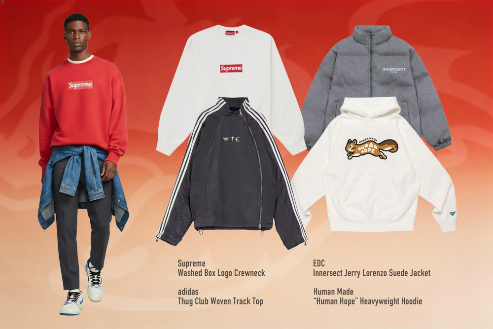 在服飾選擇上,具高度辨識度且搭配彈性高的單品,成為新年聚會與日常穿搭的安全選擇。像是 Supreme Washed Box Logo Crewneck、Human Made “Human Hope” Heavyweight Hoodie,以及結合運動與街頭風格的 adidas Thug Club Woven Track Top、EDC Innersect Jerry Lorenzo Suede Jacket,都能在不同場合中維持風格一致,展現個人品味。
