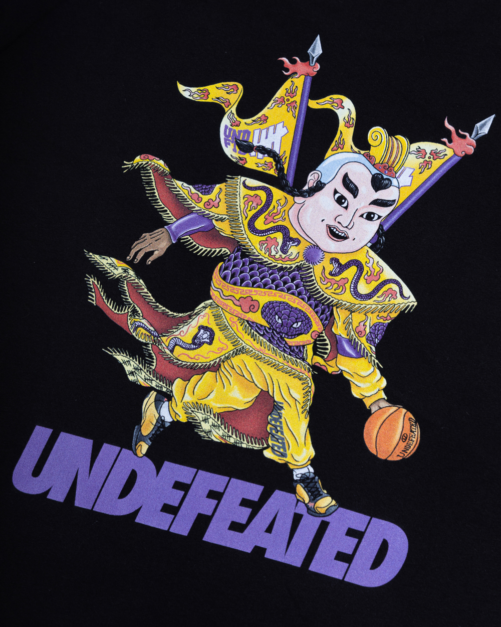 整體設計以尊貴的紫金配色為主軸,結合威嚴神將造型與 UNDEFEATED 經典五條槓旗幟,象徵品牌核心精神:不是執著於輸贏,而是拚盡全力的態度。