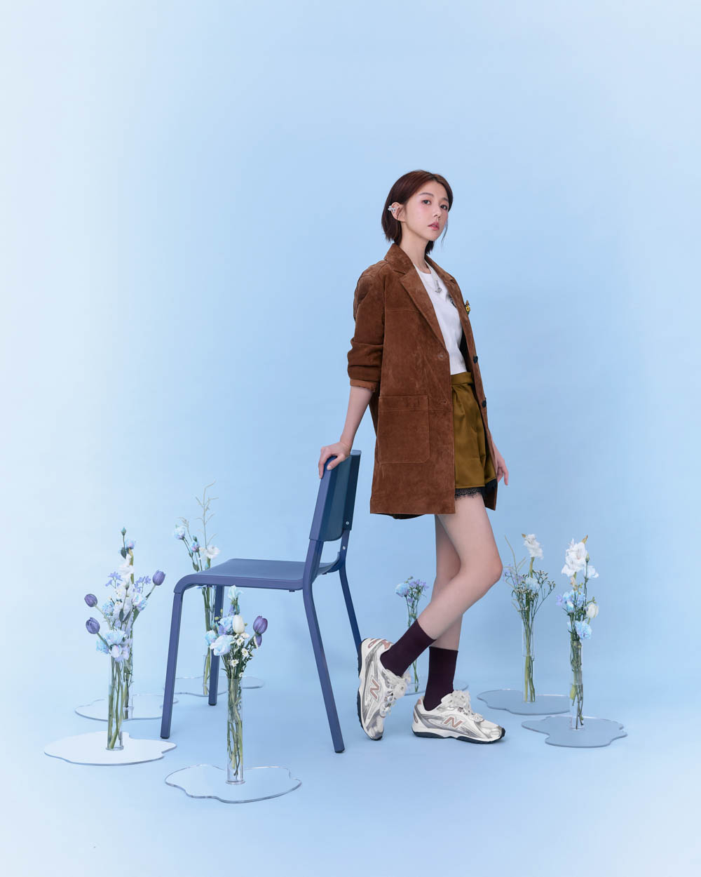 NB 471 以流線鞋型輕盈薄底鞋為設計特色,搭配柔和配色,無論是日常或是學院風造型都能輕鬆駕馭,為穿搭注入青春氛圍。邵雨薇先以NB 米棕色足球上衣搭配棕色裙子,腳踩同色系拿鐵棕 471 展現甜美輕盈穿搭,另一套則是選擇以藍色套裝搭配質感白 471,展現展現 471 秋季新色質感與清新氣息。