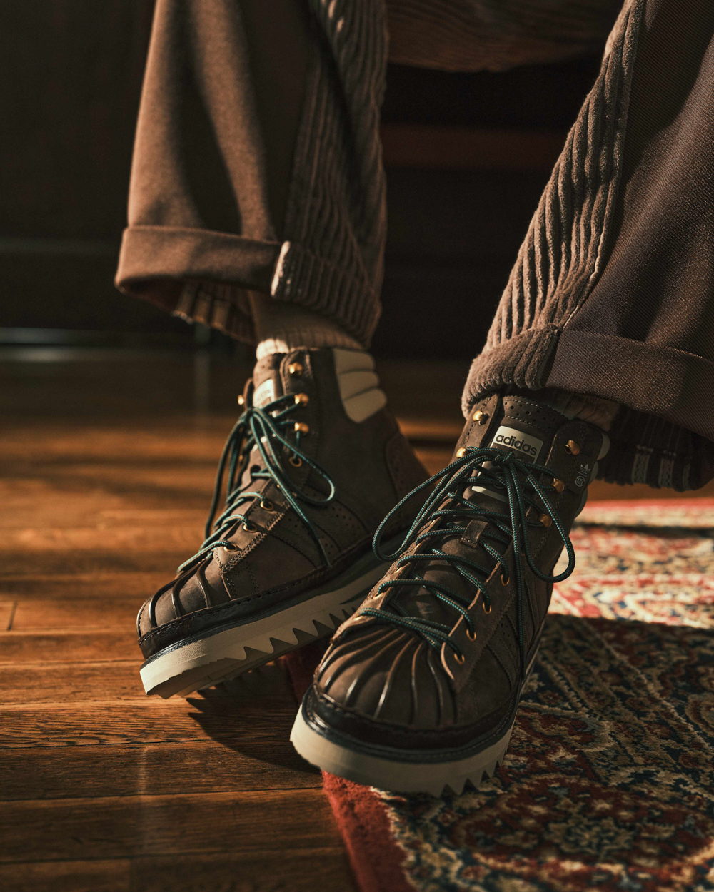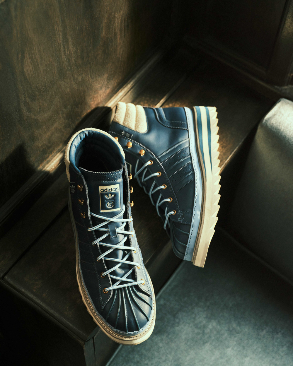 系列核心單品 CLOT Pro Model 以 adidas 經典 Superstar 為藍本,打造適合冬季穿搭的中幫靴款。鞋款提供海軍藍與棕色兩種配色,選用高級皮革搭配繩狀鞋帶,並輔以厚實鋸齒外底提升實穿性。金色鞋眼與鞋舌上的 CLOT 標誌為細節加分,讓整體在工藝質感與文化敘事間達到平衡,呈現運動美學的全新演繹——兼具粗獷與精緻的現代風格。