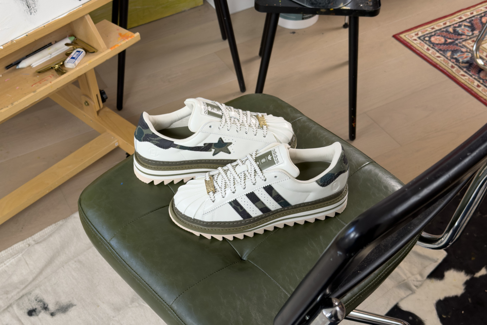 本次推出的核心是一款重新設計的 Superstar 鞋款,由陳冠希將經典鞋型轉化為高端前衛的設計。這雙三方聯名 Superstar 採用米白色高品質皮革鞋面打造,輔以立體壓紋細節,橄欖色工裝風格的點綴進一步增添實用主義氣質。