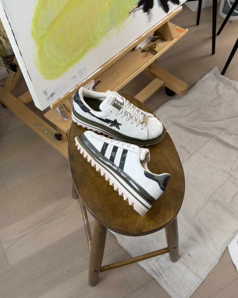 作為 adidas 的長期合作夥伴,BAPE® 憑藉突破性的街頭設計語言與標誌性的迷彩圖案享譽全球。在本次合作中,CLOT 的精緻工藝與 BAPE® 大膽鮮明的視覺風格相交匯,呈現出一雙兼具實驗精神與街頭張力的作品,表達顛覆性的創意態度與跨文化的設計視角。