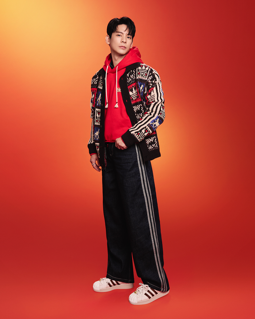 鏡頭前林柏宏換上經典潮流新造型,外搭以傳統萬家衣為靈感的拼接針織外套,三葉草與生肖馬圖案點綴新年潮流造型。內搭亮紅色印花帽 T,胸前與背後以生肖圖騰 Logo 與中國結細節點出馬年意象,俐落版型展現率性風格。復古直筒牛仔褲呼應奶油白 SUPERSTAR,皮革拼接馬毛材質與雙色鞋帶細節,為造型增添層次。