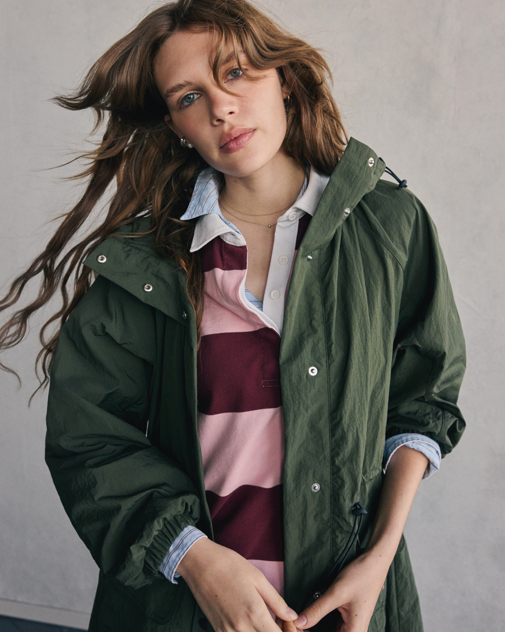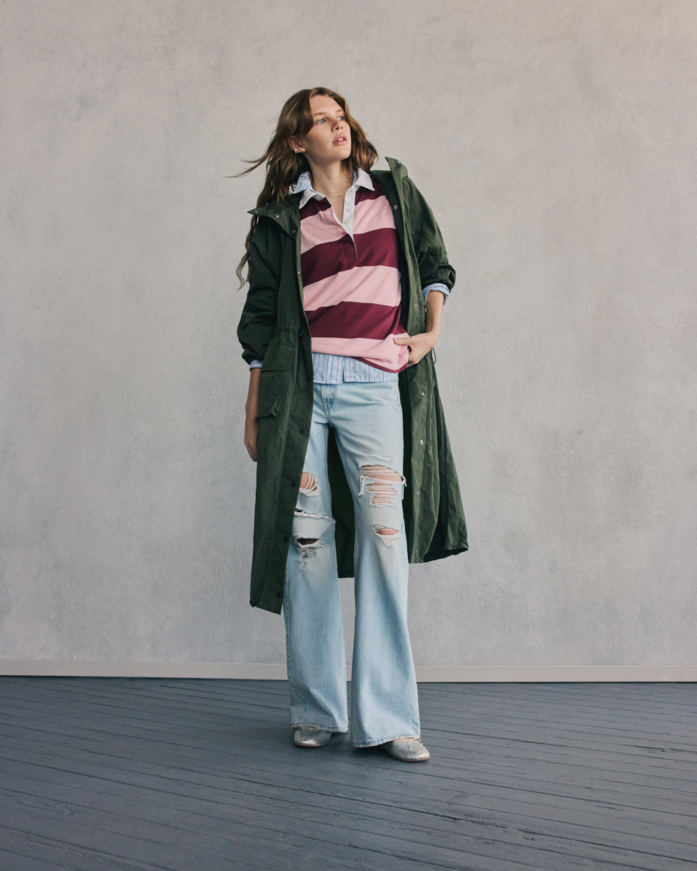 女裝系列以寬鬆靴型丹寧褲作為視覺亮點,下身輪廓呈現放鬆恣意的個性俐落氣息,並注入油漬搖滾不羈的復古刷色與仿舊細節;結合貼合腰臀的修身剪裁,在隨心所欲與精緻講究之間取得平衡,創造出獨有的碰撞美學。荷葉邊排釦背心、麻花針織圓領上衣和經典風衣外套、復古學院風條紋 POLO 衫等吸睛的上衣單品,可以多層次疊搭方式,將看似對立的美學巧妙融合,率性之餘,創造強烈的自我風格。