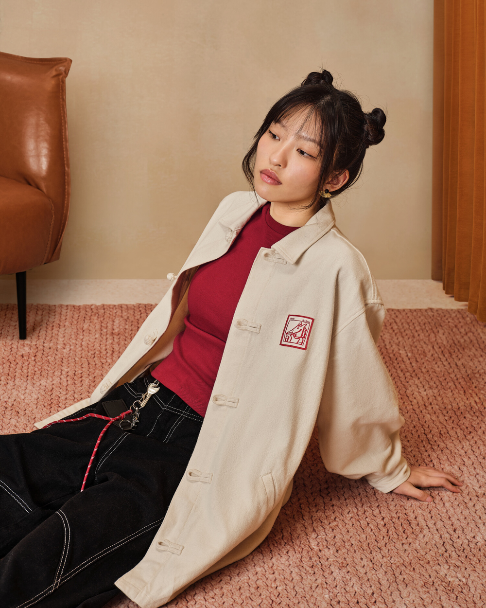 除鞋款之外,服飾設計以「開運紅」為主線色彩,輔以水墨塗鴉線條,為整體造型注入新年氣韻。襯衫外套、大學 T、POLO 衫等單品在色彩運用上動靜相宜,既呼應節日熱鬧氛圍,亦兼顧日常實穿。設計從中式服裝的輪廓與對襟結構中汲取靈感,結合街頭風格的寬鬆剪裁,營造出豐富疊穿層次。傳統盤扣、織標與印花等細節自然融和,讓祝福伴隨穿搭。