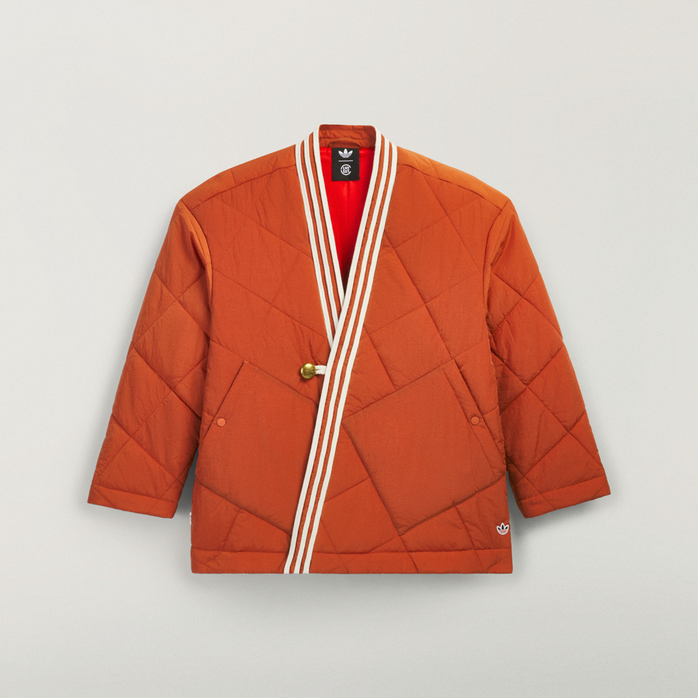 外套品項透過多層次材質工藝昇華敘事。CLOT 夾克採用絎縫皺褶尼龍面料製成,並填充 PrimaLoft Gold 合成羽絨。此為陳冠希本人在系列中的摯愛之作,他親自調整條紋走向,形成獨特領部圖案,在微妙突破常規的同時,致敬經典中式羽絨服廓形。精緻的緞面內襯、緞面編織繩、Concho 扣飾以及雙按扣插手口袋,共同打造出一件兼具儀式感與實用性的單品。