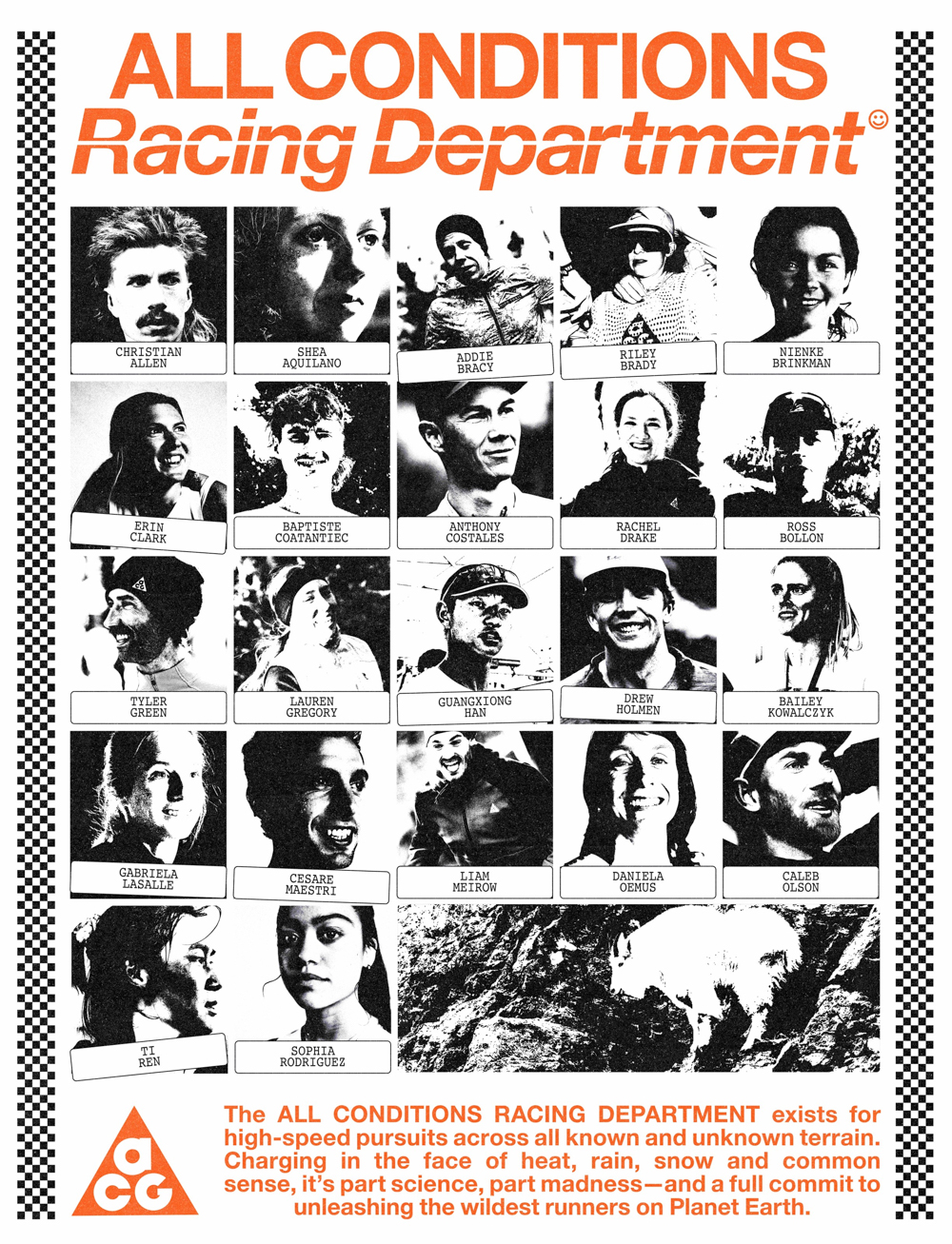 ACG 對戶外運動員的支持也展現在 All Conditions Racing Department:一支由專為追求突破、敢於挑戰極限的越野跑者組成的菁英隊伍。本季,多位新成員的加入使現有 22 位菁英運動員的隊伍陣容進一步升級擴大。運動員們將繼續攜手 ACG 實測原型產品、提供回饋,用不斷突破運動極限的方式,助力 ACG 開創越野裝備性能的新未來。