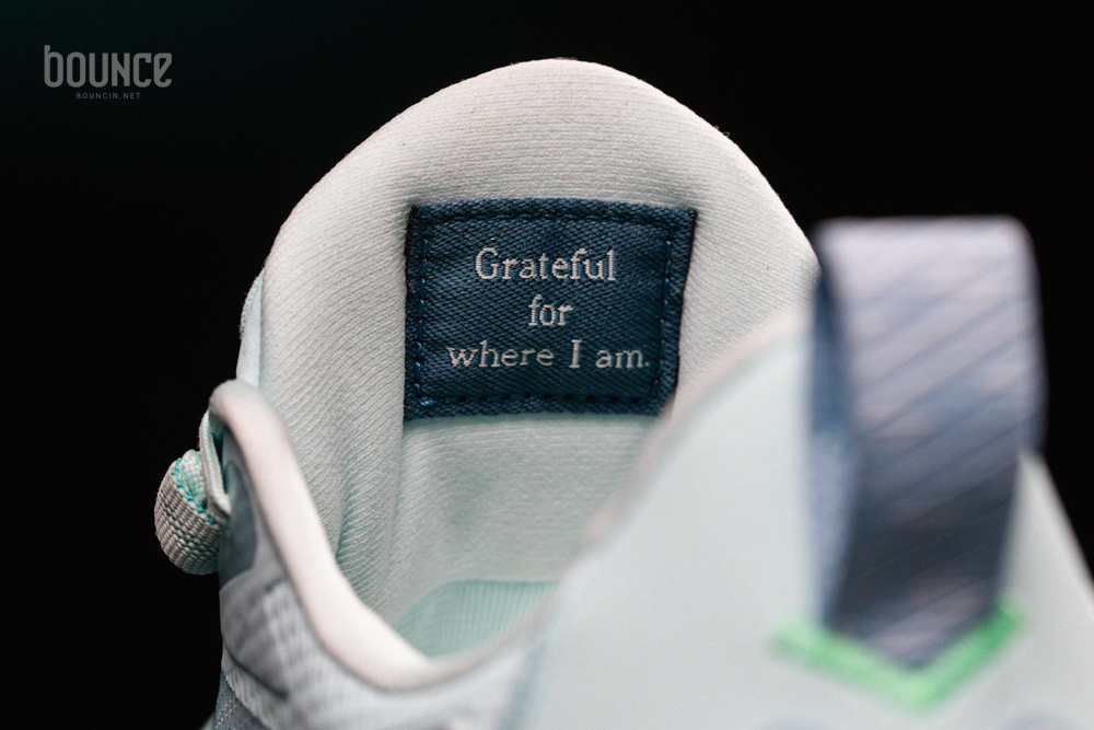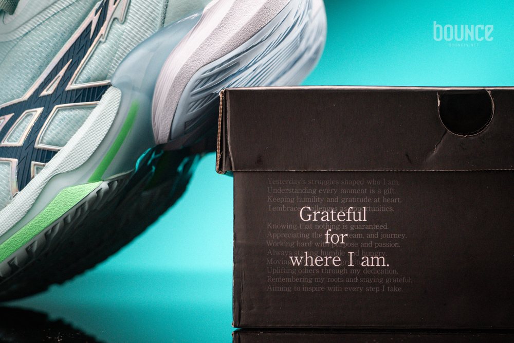 整體設計中隱約可見閃電圖騰,象徵河村在球場上快速而充滿能量。鞋舌內側的 Grateful for where I am,提醒他不忘初心,珍惜來之不易的一切。