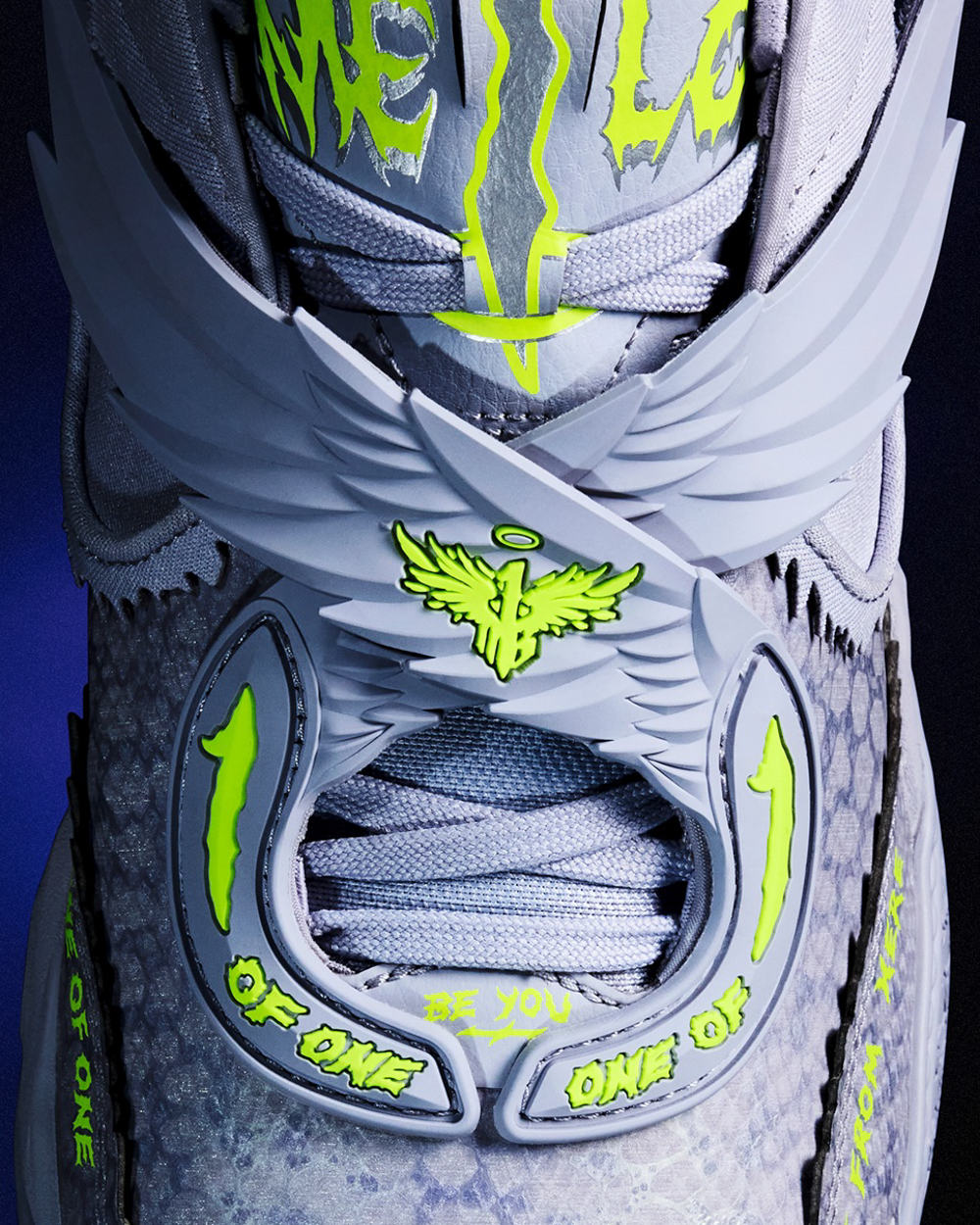 MB.05 Metallic 以大面積金屬銀打造強烈存在感,一眼就能辨識的未來感視覺。螢光綠與亮紅色的霓虹細節,呼應 Melo「1 of 1」的獨特能量,呈現專屬於他的張力與個性。鞋舌、後跟到大底皆延續 Melo DNA 概念,打造立體骷髏頭、象徵「1」的標誌性元素──讓整雙鞋的設計層次更鮮明、更有識別度。