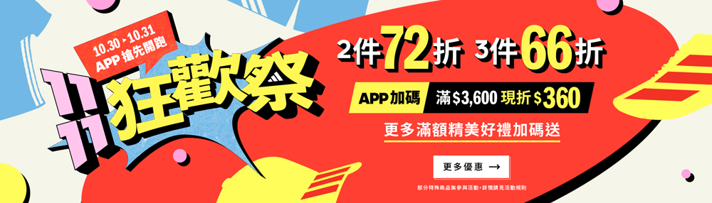 adidas「1111 狂歡祭」正式開跑 官網限時 2 件 72 折、3 件 66 折 天天再抽「整單免費」!
