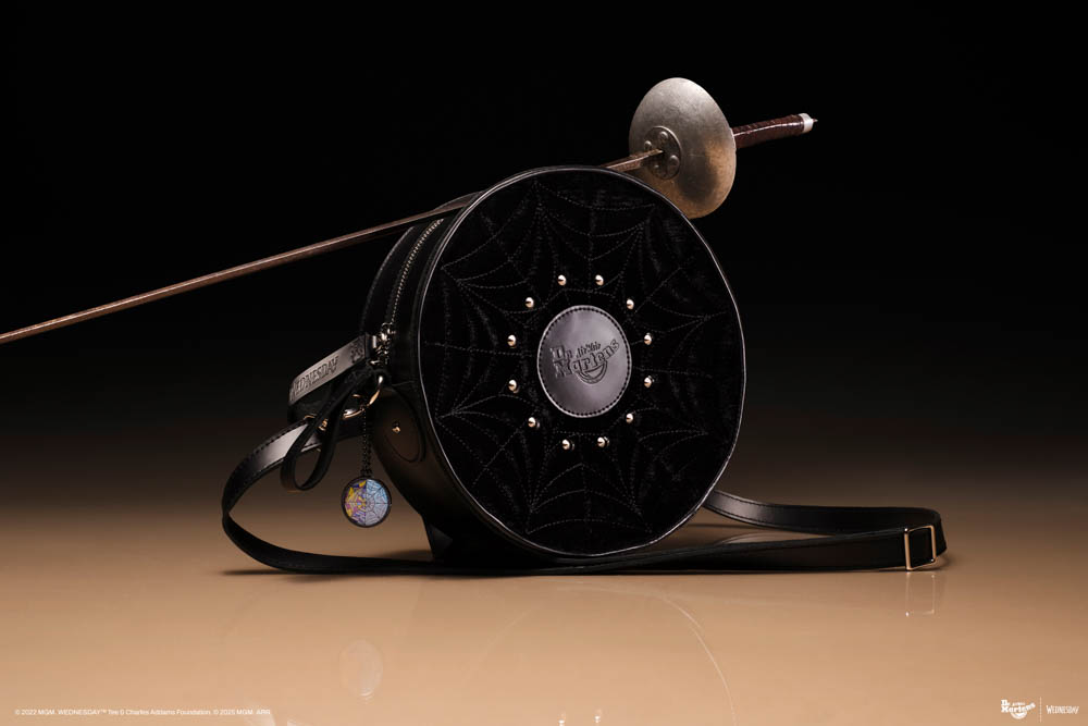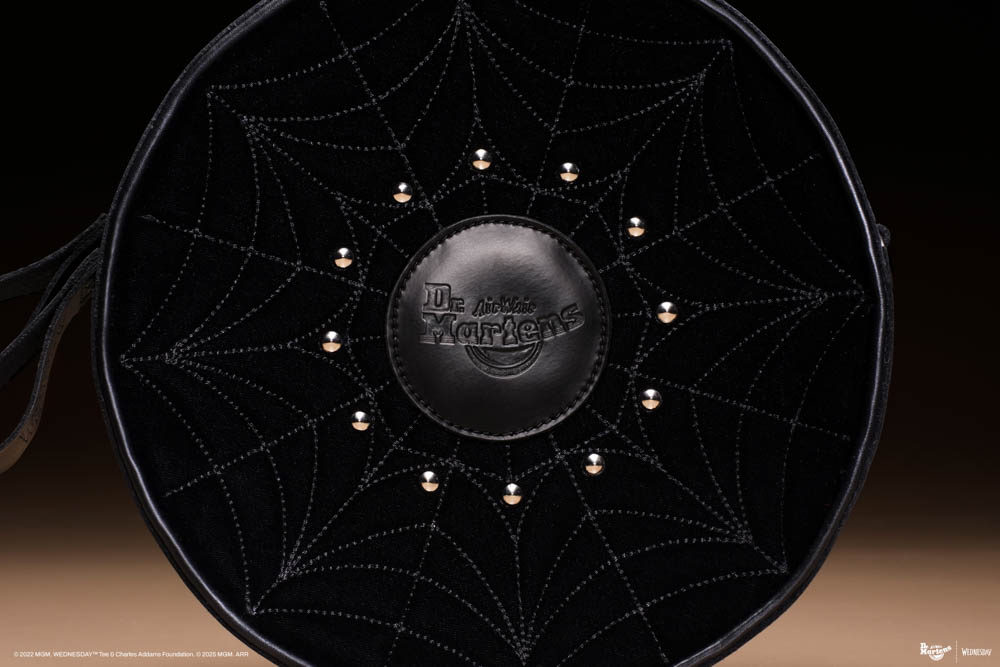 本季聯名特別推出圓形肩背包,以黑絲絨面料搭配 Kiev 皮革製成;銀色錐形鉚釘與放射狀蜘蛛網刺繡宛如星期三·阿達的犀利目光,將危險與魅力同時放大。專屬 "WEDNESDAY" 字樣皮革拉鍊頭與銀色五金細節在細節間彰顯獨特態度;吊飾完美還原奈落學院的歌德彩繪窗,散發詭譎又華麗的氣息。
