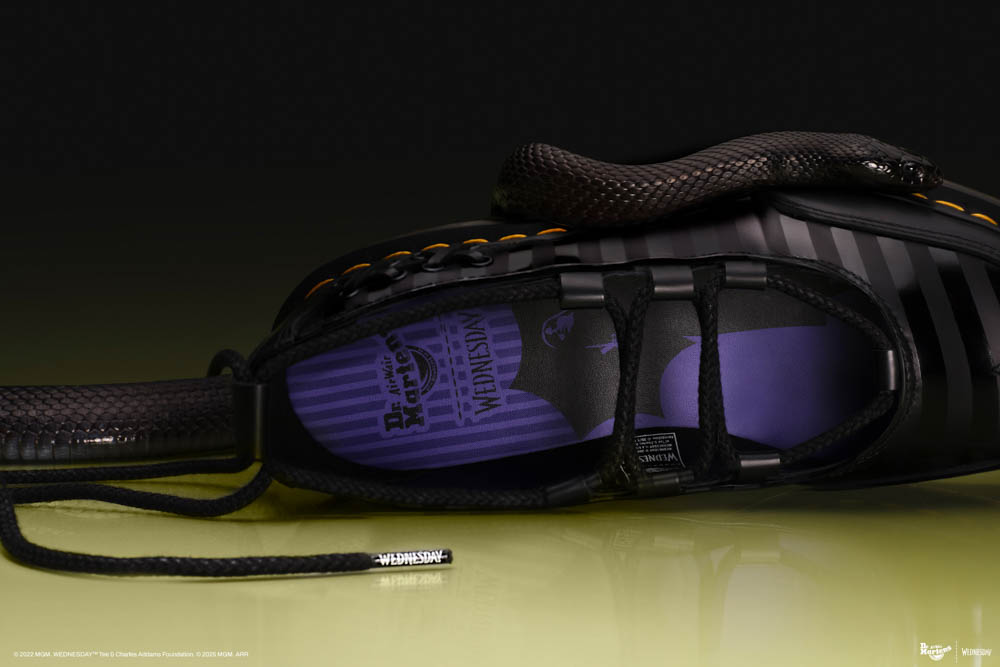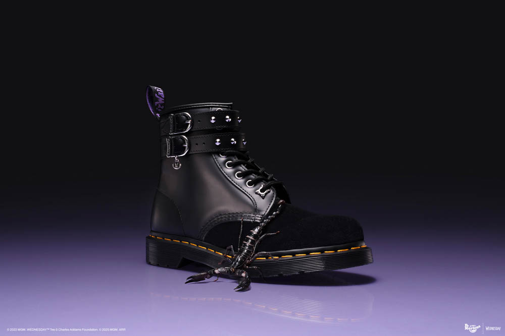 在第二季中,星期三·阿達重返暗潮洶湧的奈落學院,以冷冽姿態直面命運與挑戰。Dr. Martens 將經典 1460 八孔馬汀靴注入暗黑細節。鞋面採用黑絲絨拼接 Nappa Lux 皮革,雙扣帶點綴銀色錐形鉚釘,彰顯鮮明叛逆型格;標誌性的紫色後跟拉環與鮮明黃色縫線形成強烈對比,並以專屬 "W" Logo 與後跟標語 "OUTCASTS ARE IN",讓 1460 靴成為星期三·阿達「生而異類」精神的最佳註解。