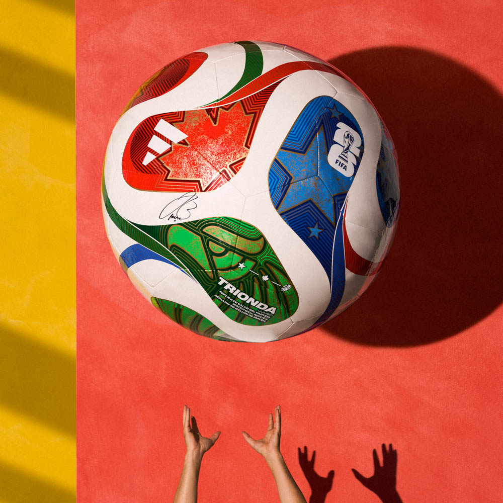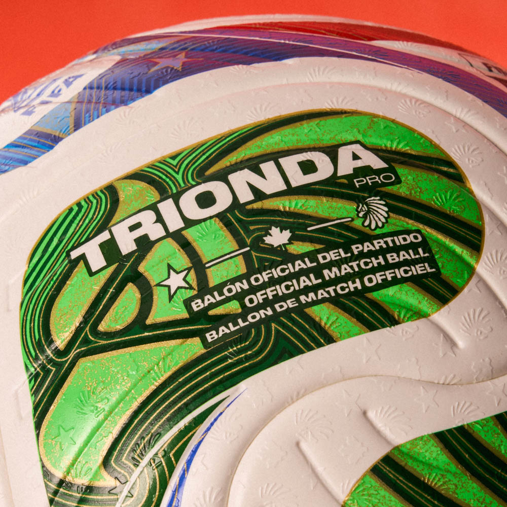 TRIONDA 在球面圖案彰顯各個主辦國特色,不僅紅、藍、綠三色即代表美國、加拿大與墨西哥,球身也佈滿星星 (美國)、楓葉 (加拿大) 與老鷹 (墨西哥) 等細緻壓花圖樣,紀念三個國家首度攜手舉辦世界盃的歷史性時刻。金色勾線貫穿球面,以冠軍榮耀之色體現出世界最高榮耀。