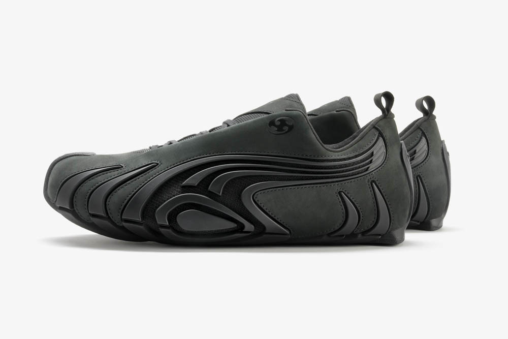 TALON 鞋款整體以沉穩的黑灰麂皮為基調,透過經典麂皮鞋面搭配橡膠質感拼接,做出材質的對比,以利爪的概念呈現 PUMA 經典彎刀,於鞋身環繞延伸,隨步伐反射光線,形成動態光影效果,最後搭配低調的聯名標示點綴細節,展現雙方對街頭機能的前衛詮釋。