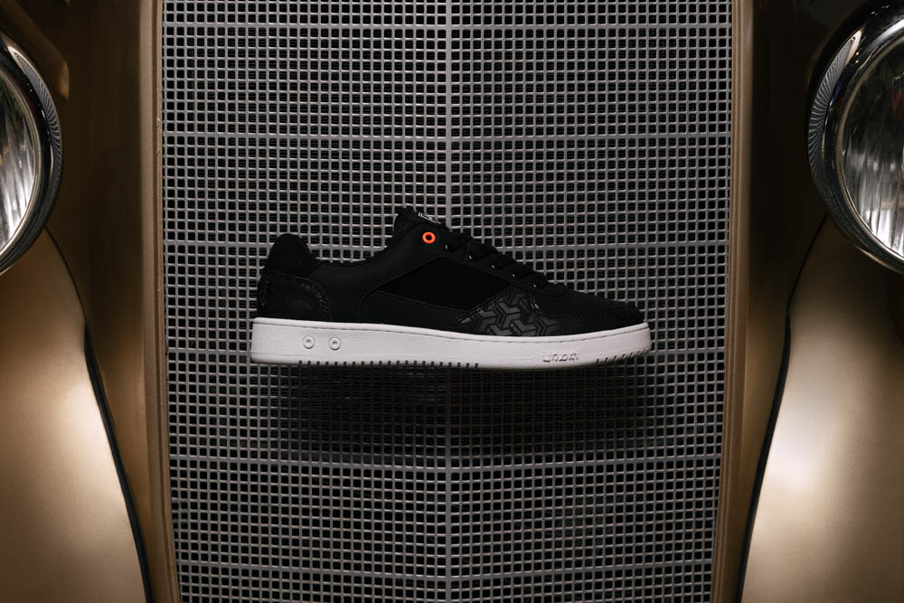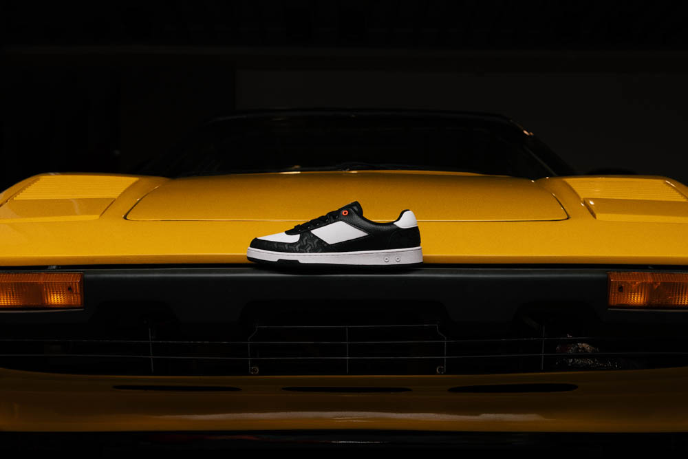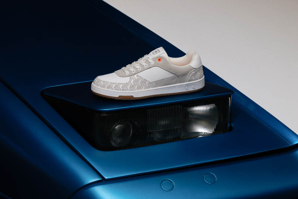 UD 延續一貫的黑灰色調與設計線條,融入 EMC 的老花語彙與動態節奏,結合內化為一種可穿戴的狀態。鞋款結構借鑑EMC經典老花的包覆概念,透過層次皮革與立體縫製,形塑出兼具張力與平衡的輪廓,從壓紋皮革、碳纖維元素到刺繡細節,每個細節都在訴說一種「動力美學」。