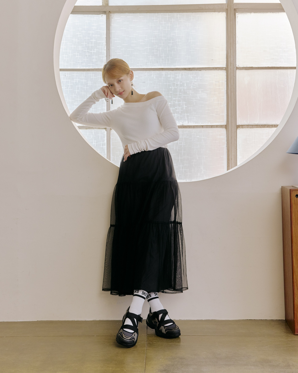 極簡的黑白配色搭配紗紡衣裙,在 SKECEHRS UNO RYZE 與 VAPOR FOAM MOVE 瑪莉珍鞋的襯托下,化成一股帶有故事感的韓系電影氛圍。SKECEHRS UNO RYZE 瑪莉珍鞋以深邃的黑色鞋面搭配細緻金色勾勒線條,與輕柔紗裙穿搭形成微妙平衡,是一種沉穩之間帶著光影流動的氣息;而搭載 Slip-ins 瞬穿舒適科技的 VAPOR FOAM MOVE 鞋款則以超輕量中底讓步伐自然變得輕盈,俐落的鞋面線條修飾腳背比例,為冬季偏厚重的穿搭創造了呼吸的空間,安靜卻醒目、低調卻自成氛圍,這份穿梭女孩與女人間的優雅不靠堆疊,而是從細節裡自然流露。
