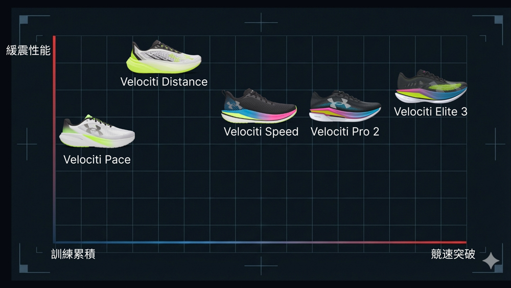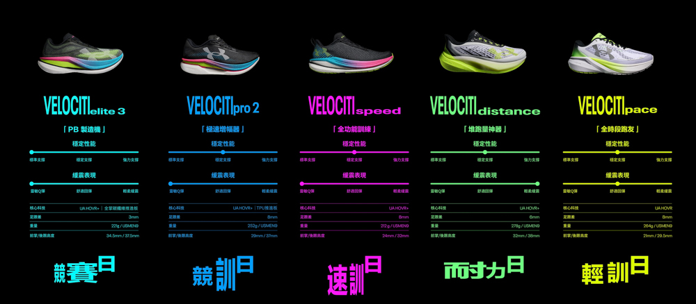 全系列共推出五雙鞋款,從 Team UA 馬拉松選手 Sharon Lokedi 於 2025 年波士頓馬拉松奪冠時所著用的碳板鞋「VELOCITI ELITE 3」,到適合日常輕鬆練跑的多功能鞋款,全面應對跑者在不同訓練階段與強度下的實際需求,陪伴每一位跑者。
