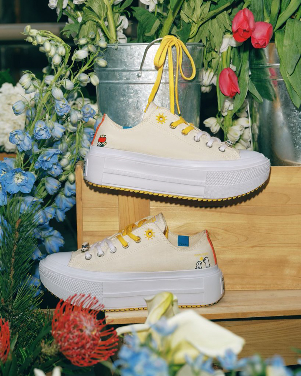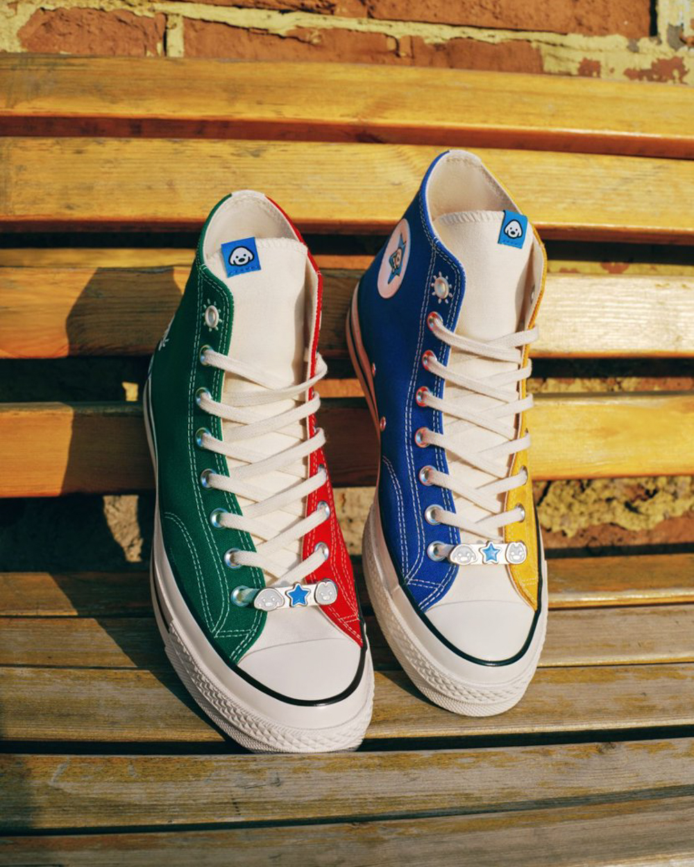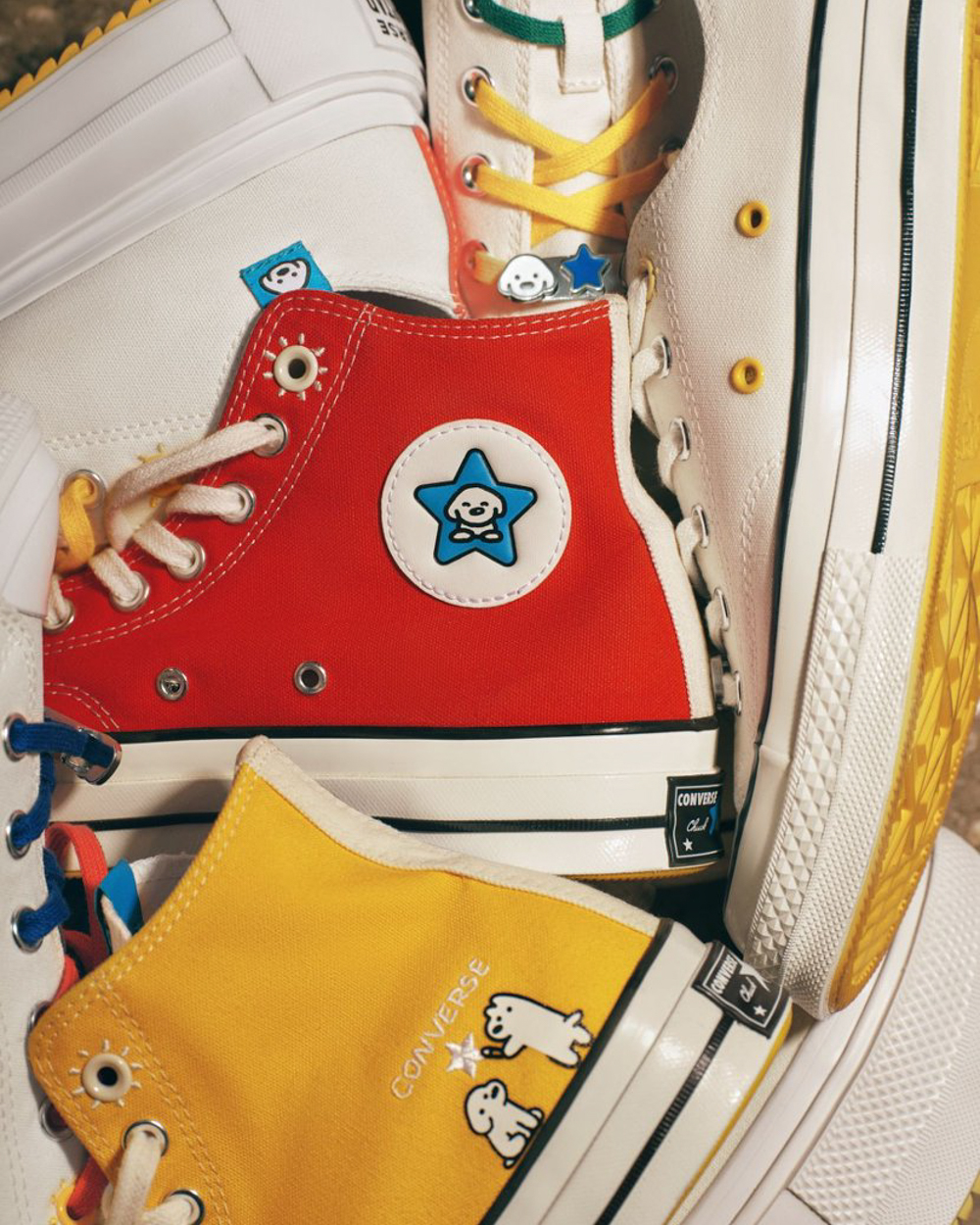 系列帶來兩款 CHUCK 70 聯名鞋型:多彩 70 高筒鞋款透過不對稱撞色設計呈現更鮮明的視覺層次,鞋側點綴聯名圖案,並搭載 ORTHOLITE 避震中底,在經典外觀之中兼顧舒適腳感;彩繪 70 低筒鞋款延續條紋橡膠鞋底與帆布鞋面結構,以更輕鬆的配色與插畫細節呈現自然隨性的風格與高級質感。兩款鞋型均附帶多組鞋帶,並配有聯名配件包,讓風格切換更加自由。